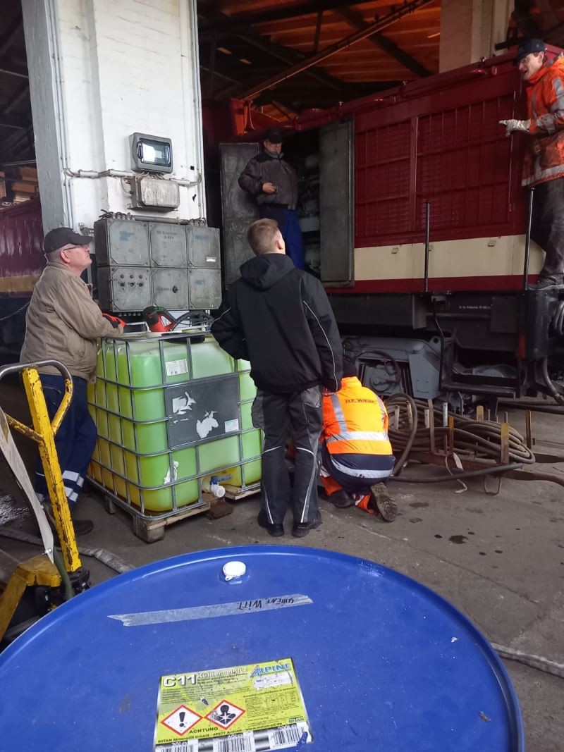 Even more modern vehicles need maintenance from time to time as well. In the next picture, the coolant of diesel loco 114 774 is being replaced. The new one has enough antifreeze. It is delivered in concentrated form in drums and has to be mixed with water. The liquid is first pumped from the blue barrel in the foreground into the square container, diluted with water and then fed into the locomotive's cooling system. You are probably wondering how much coolant such a locomotive engine needs: about 750 litres.