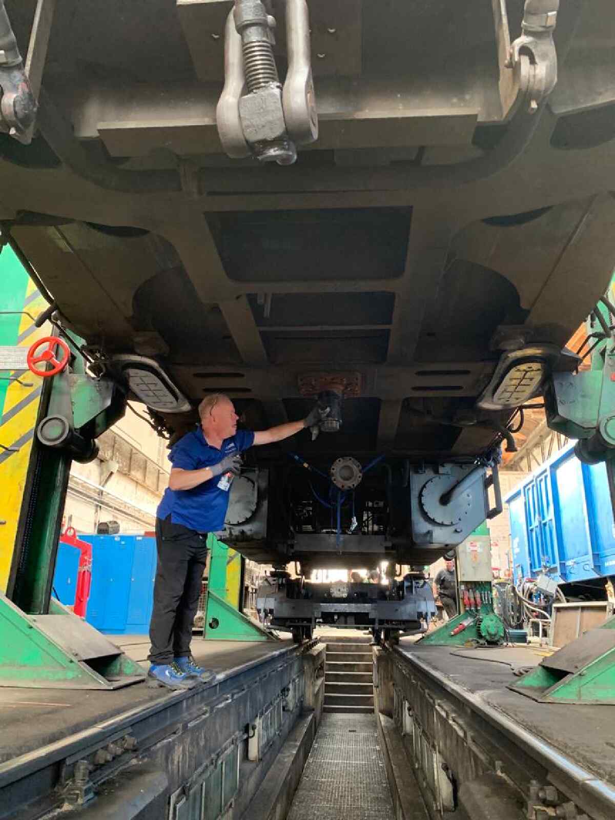 Afterwards, the pivots were cleaned and examined for cracks using ultrasound. They are located under the locomotive body and form the central connection to the bogies. Fortunately, both pivots turned out to be in perfect condition.