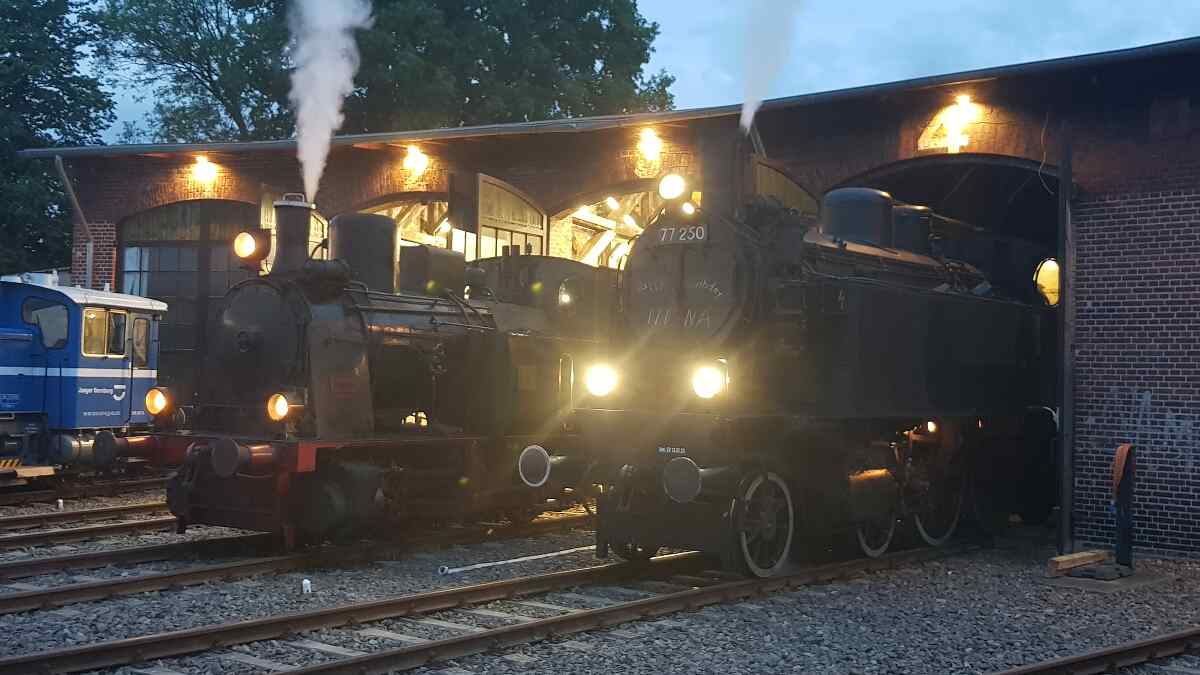 In the evening, our little one was allowed to spend the night in or in front of the Luckau engine shed. At times, she was accompanied by the Austrian steam locomotive 77.250, which is now operated by the Eurovapor association based in Würzburg.
