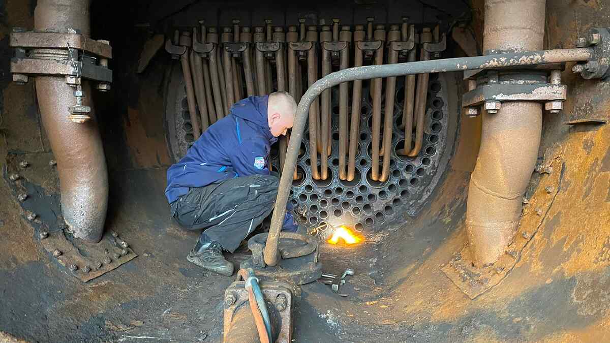 In particular, this includes work on our steam locomotive 50 3570, which we would like to present in working order again next year. To do this, we have to complete a number of tasks that are quite time-consuming. This includes in particular the boiler repair, which is now being prepared. Last Saturday, we joined forces to wash out the boiler. To do this, all the wash hatches were removed. These are mushroom-shaped closures that seal small oval openings in the boiler wall, through which impurities and limescale residues can be flushed out of the boiler with a strong jet of water. As the nuts holding the plugs are sometimes extremely tight, they have to be heated red-hot with a flame so that they expand slightly and can be loosened.