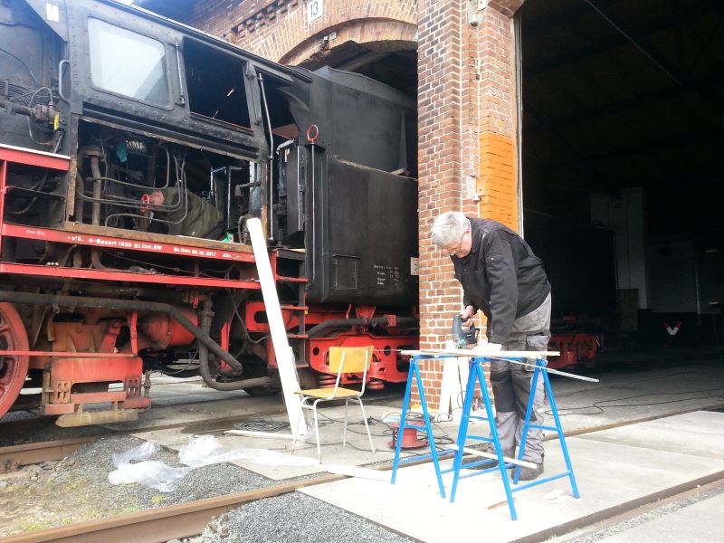 In the last few days, members have had their hands full. The maintenance work on various vehicles went into the final round so that the locomotives would be ready for operation for our forthcoming event at the beginning of May. The main boiler inspection on 50 3570 was completed, while the connecting rods, which transmit the power from the steam cylinders to the driving axles, also still had to be mounted.