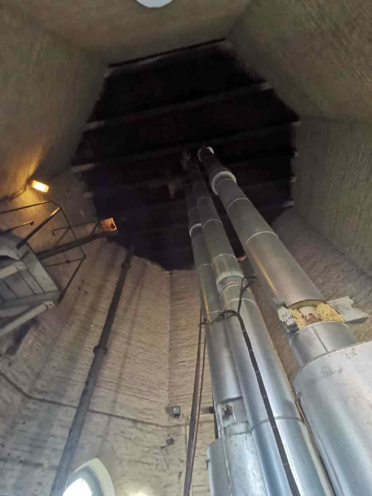 Oberhalb der Zwischendecke erreicht man den Vorratsbehälter. Eine weitere Treppe führt nach oben zum oberen Rand des Behälters