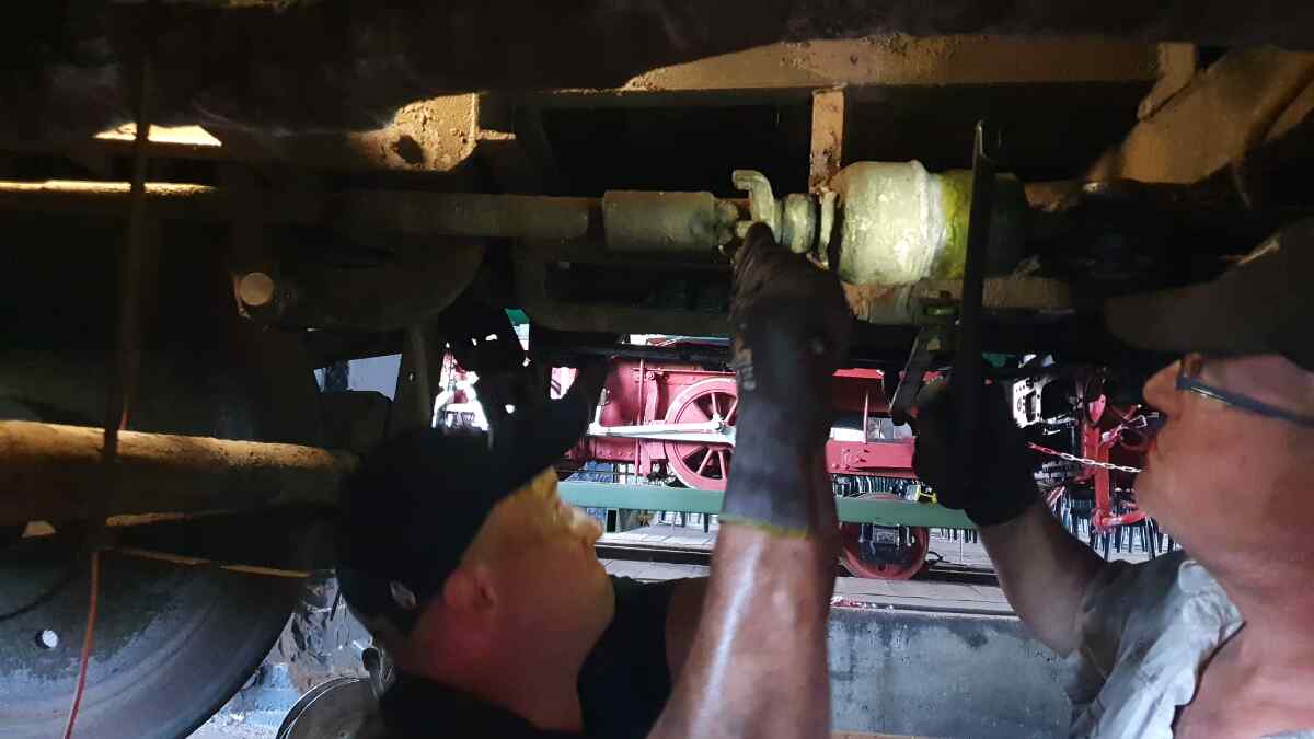 From the diesel fraction, we will probably show you our small locomotives of the Deutsche Reichsbahn and the Osthannoversche Eisenbahn. You will also see the large diesel locomotives V320 and probably 114 774, the latter of which we are still working on during its main inspection. In the meantime, the cardan shafts of the locomotive have been reinstalled and the brake parts have been assembled. So it can run and brake again.