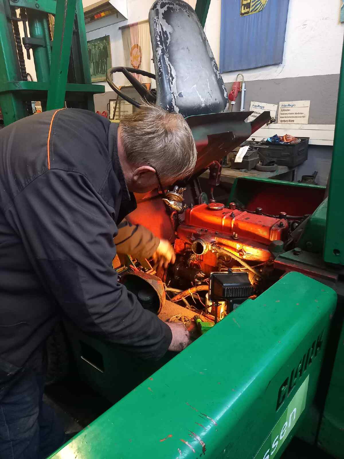 ... the activities shifted to the engine shed for the time being. Here there is progress to report on our excavator T174. After intensive reconditioning of the drive and the auxiliary units as well as the replacement of all hydraulic lines, the assembly is now so far advanced that the operating fluids can be filled. The first test run is imminent.