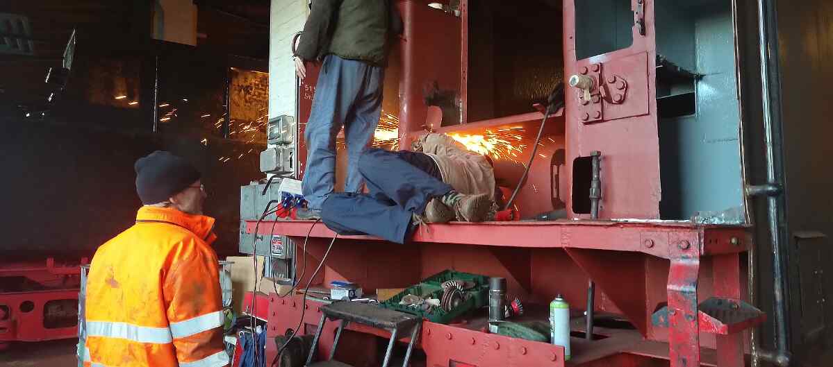 Work also continued on the tender of the 50 3570. Some of the sheet metal on the front end, which often rusts through, was replaced. This is a known weak point on the tenders. We hope that the repair of the vehicle can now finally be completed. While one person prepares the sheet metal, others weld it in.
