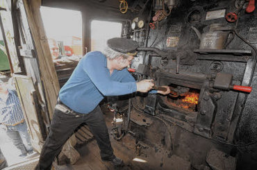 Heizer Gernot Gattermann schippt in der großen Dampflok vor der nächsten Fahrt Kohlen nach.