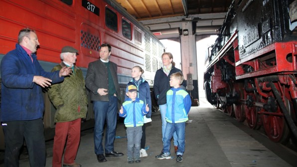 Informationen aus erster Hand erhält Familie Dyckerhoff/von Saldern im Historischen Lokschuppen von Dirk Endisch (l.). |