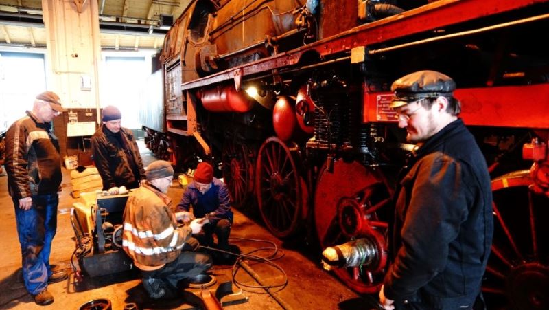 Abgebaut und überprüft wurden auch die Treib- und Kuppelstangen, anschließend überarbeitet und gefettet. Diese Montagearbeiten sind nur als Team zu bewältigen, jedes Teil wiegt mehrere hundert Kilogramm. Auch die Rauchkammer wurde geöffnet, gereinigt, geprüft. Dort wird der für das Ansaugen der Verbrennungsluft erforderliche Unterdruck erzeugt, indem der aus den Zylindern austretende Abdampf durch ein unter dem Schornstein angeordnetes Blasrohr in die Rauchkammer geleitet wird. Dort befinden sich auch die Überhitzerelemente zur Erhöhung von Dampftemperatur und -druck.