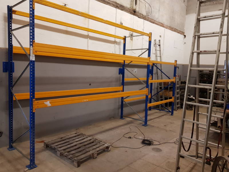 Fortschritte macht auch unser neues Regalsystem. Es ist nun aufgebaut und provisorisch ausgerichtet. Als nächstes wird es im Fußboden und an der Wand verankert und ist dann einsatzbereit. Sie wundern sich vielleicht, warum keine Regalböden zu erkennen sind? Die Antwort ist einfach: Es ist dazu gedacht, mit dem Gabelstapler Paletten hineinzuheben. Diese werden dann auf den gelben Traversen stehen.